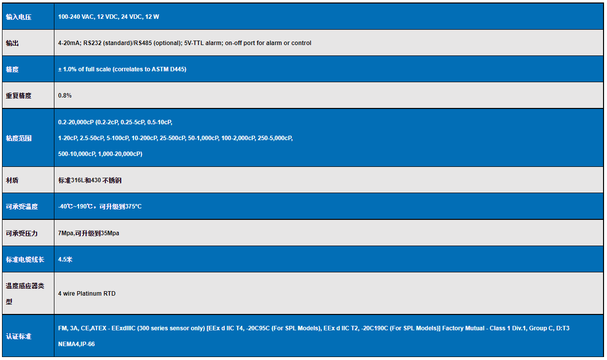 VISCOpro2000 在線粘度計技術參數: