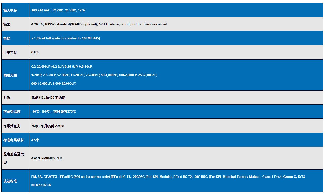 VISCOpro2000 在線粘度計規格參數: