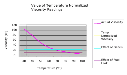 為了確定石油是失敗的,重要的是規(guī)范化粘度數(shù)據(jù)到一個單一的溫度。在規(guī)范化的溫度下可以容易看出改變由于污染或退化。temperature-viscosity關(guān)系的一個例子是圖示1所示下面。在這展覽,粉色線表示特性粘度值10 W30潤滑油溫度范圍從30°C到100°C。黃線規(guī)范化粘度值單一溫度,在這種情況下80°C。顯然同樣的石油在相同溫度下具有相同的粘度值18。Temperature-normalized度量cP的上方或下方,黃線顯示有問題的石油特征。通過這種方式,我們可以使用實際運行數(shù)據(jù)在所有的操作溫度,進行規(guī)范化,然后知道如果石油是在正確的范圍內(nèi)。我們把這些規(guī)范化粘度值作為“溫度補償粘度”或TCV。